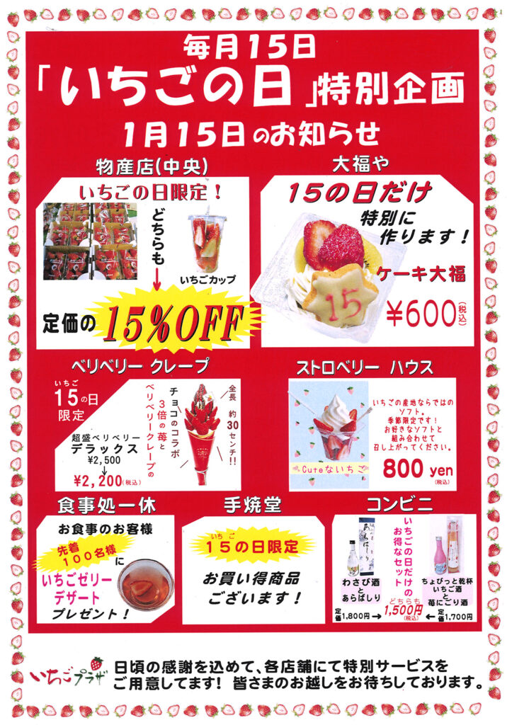 2026年最初の15日が、もうすぐやってきます。今年もやります! 「15(いちご)の日」 いちごの美味しい季節でもありいちごを使った商品のサービスを行う店舗も多いです! 「15の日」を待ちわびてくださるお客様が増えるといいなと願いつつ、従業員一同、みなさまのお越しをお待ちしております。 1月15日(木)、どうぞいちごプラザへお寄りくださいませ。
